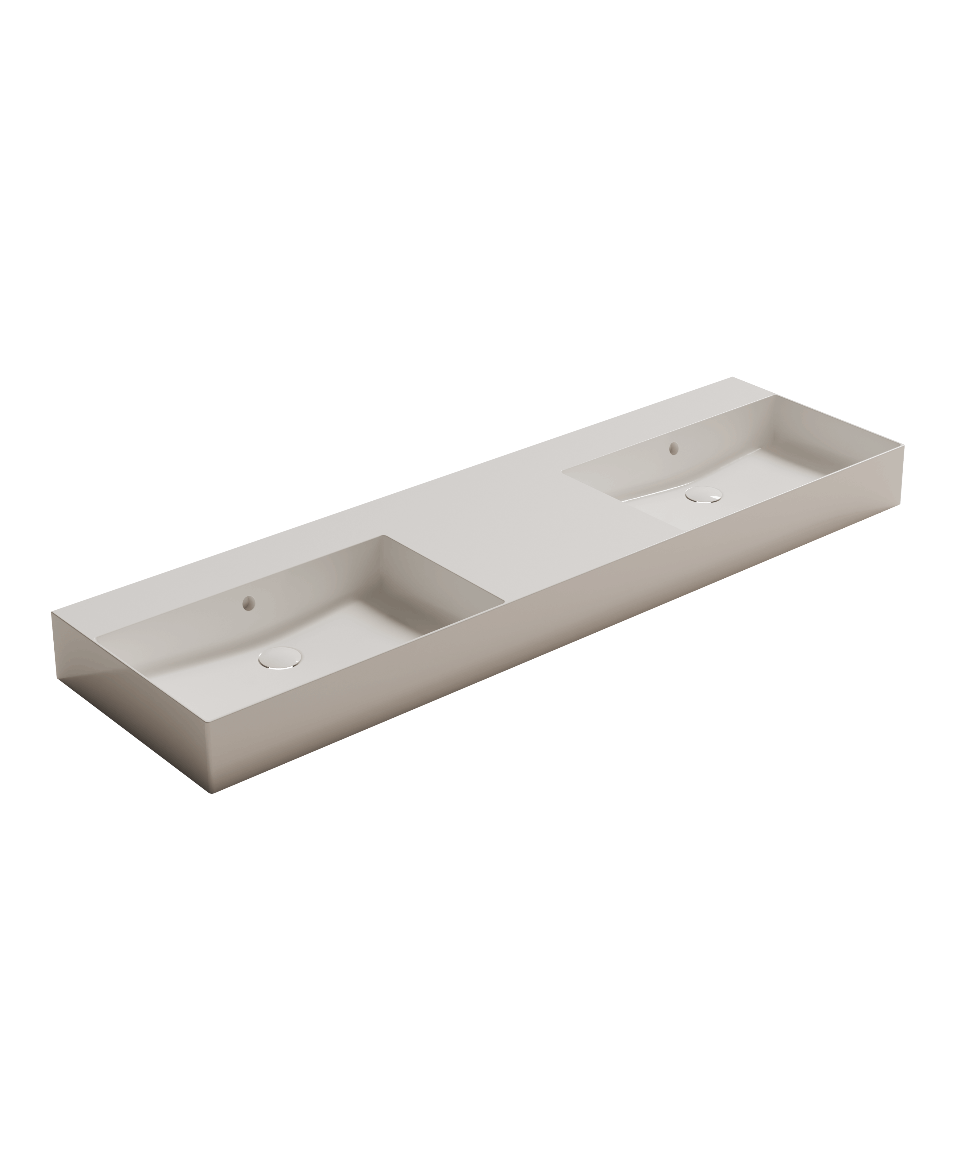 Consolle doppia vasca appoggio e parete 160x46 in ceramica progettata per ambienti condivisi o per composizioni più architettoniche. Le due vasche si inseriscono in un disegno essenziale e misurato, dove il profilo sottile valorizza l’insieme con eleganza e rigore contemporaneo.