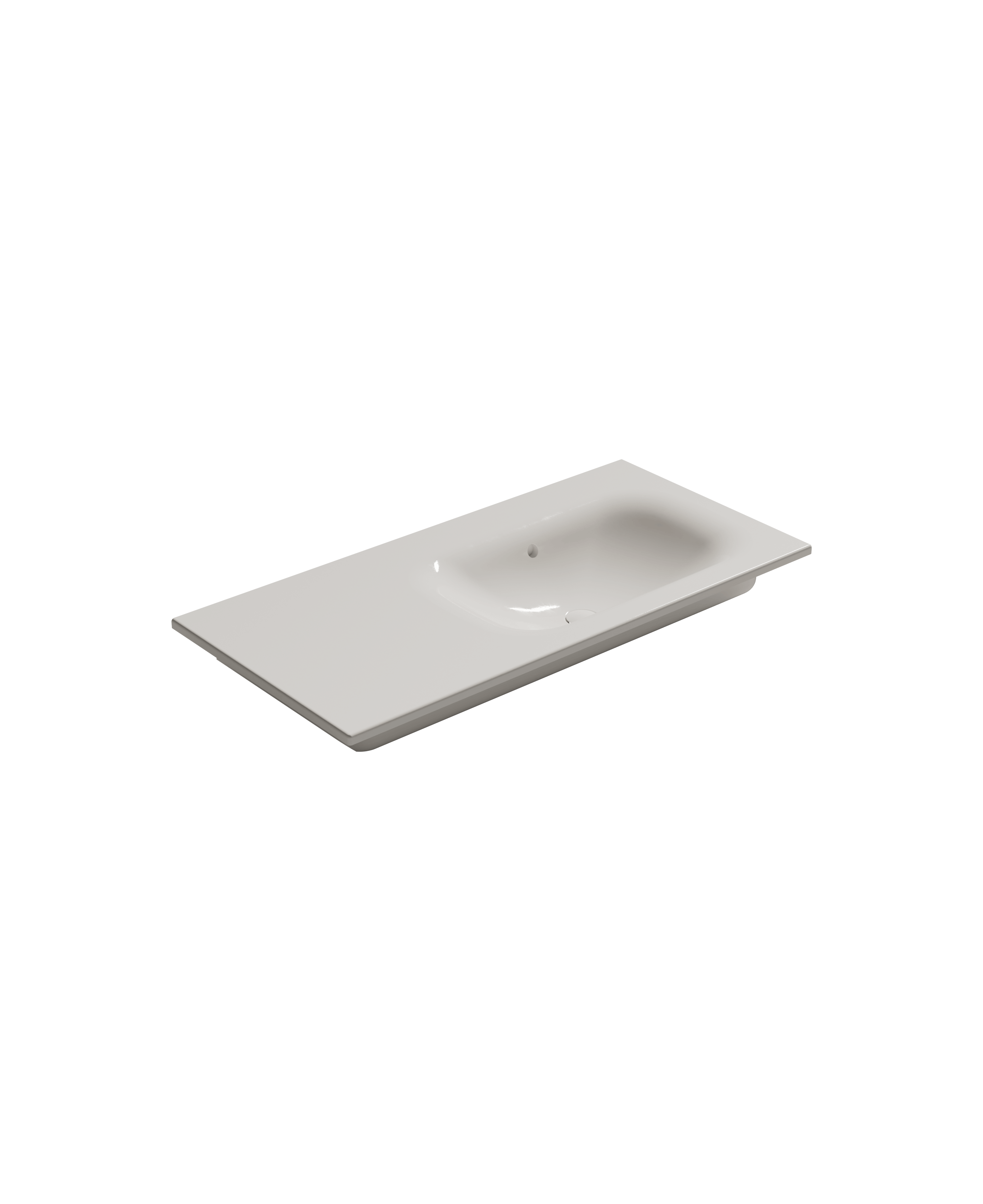 Lavabo incasso 106x51 DX in ceramica che introduce una composizione dinamica e contemporanea. La vasca laterale dialoga con il piano in modo naturale, mentre il bordo sottile e il disegno pulito mantengono il progetto leggero ed elegante.